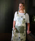 Serenity blooms and colour whispers, subtle tones of olive, mauve, blues and neutrals. Features a dual patch pocket on the front with straps that cross over the back and loop through eyelets at the waist.